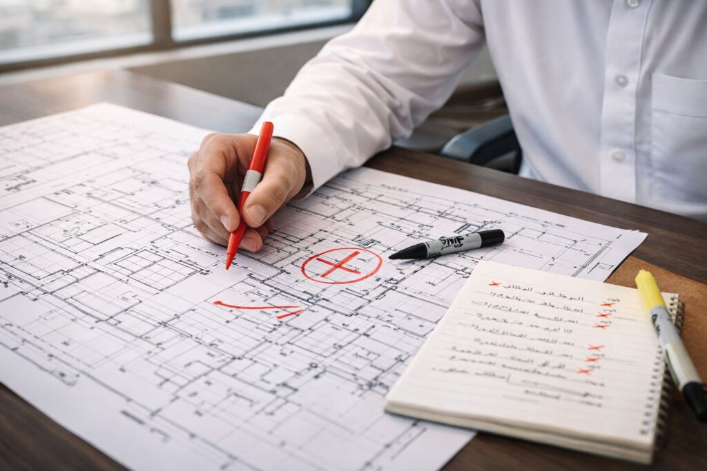 نقوم بـ مراجعة المخططات ومراجعة عقد المقاول وجداول الكميات، وذلك للتأكد من وضوح البنود وحمايتك من التكاليف الخفية.